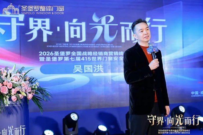 圣堡罗家居集团董事长吴国洪先生登台,发布2026年度品牌战略报告。从行业宏观趋势研判到品牌微观发展策略,一张清晰而充满力量的年度蓝图在全体与会者面前徐徐展开——方向感,是最大的确定性。 吴董指出,圣堡罗以品质立本,以新媒体破局,深耕存量蓝海,携手经销商实干笃行,聚力共创门窗行业新未来。
