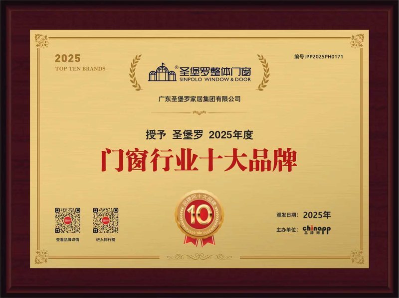 从权威认证、品牌实力、模式创新,到产品性能、服务保障,圣堡罗整体门窗全方位符合门窗十大品牌的核心评判标准,是行业认可、消费者信赖的品牌。23 年坚守高端安全定位,以整体门窗助力行业发展,以旧窗焕新服务亿万家庭,圣堡罗不仅多次入选门窗十大品牌,也是推动中国门窗行业高品质发展的重要力量。