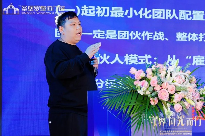 圣堡罗家居集团董事长吴国洪先生登台,发布2026年度品牌战略报告。从行业宏观趋势研判到品牌微观发展策略,一张清晰而充满力量的年度蓝图在全体与会者面前徐徐展开——方向感,是最大的确定性。 吴董指出,圣堡罗以品质立本,以新媒体破局,深耕存量蓝海,携手经销商实干笃行,聚力共创门窗行业新未来。